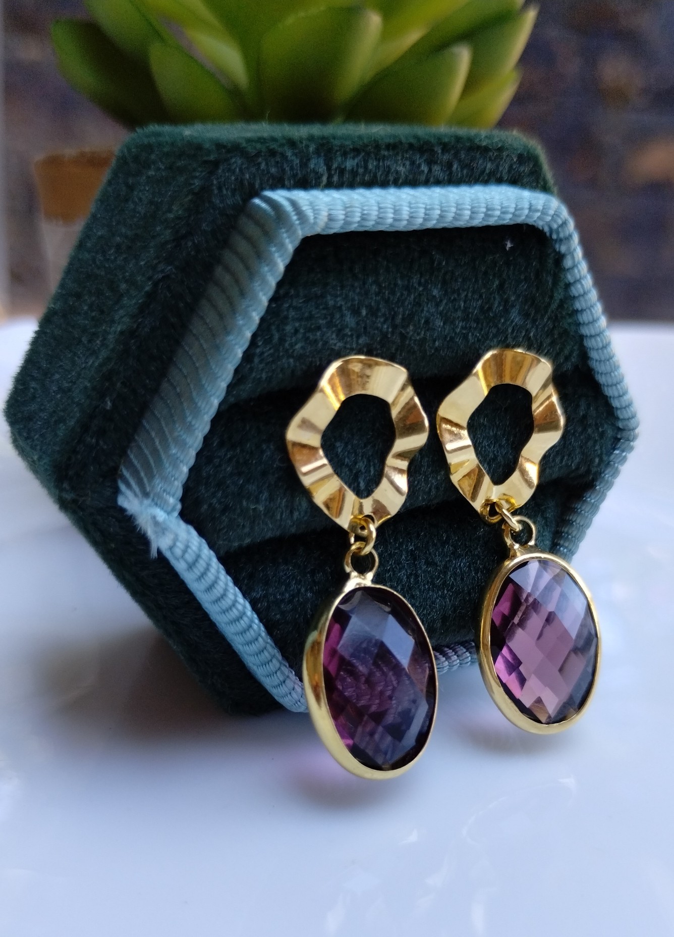 Transforme seu look com este brinco delicado e sofisticado. Sua base em formato de gota ondulada banhada a ouro 18K transmite modernidade e exclusividade, enquanto o pingente em gota bordô facetada adiciona um toque de cor e brilho único.