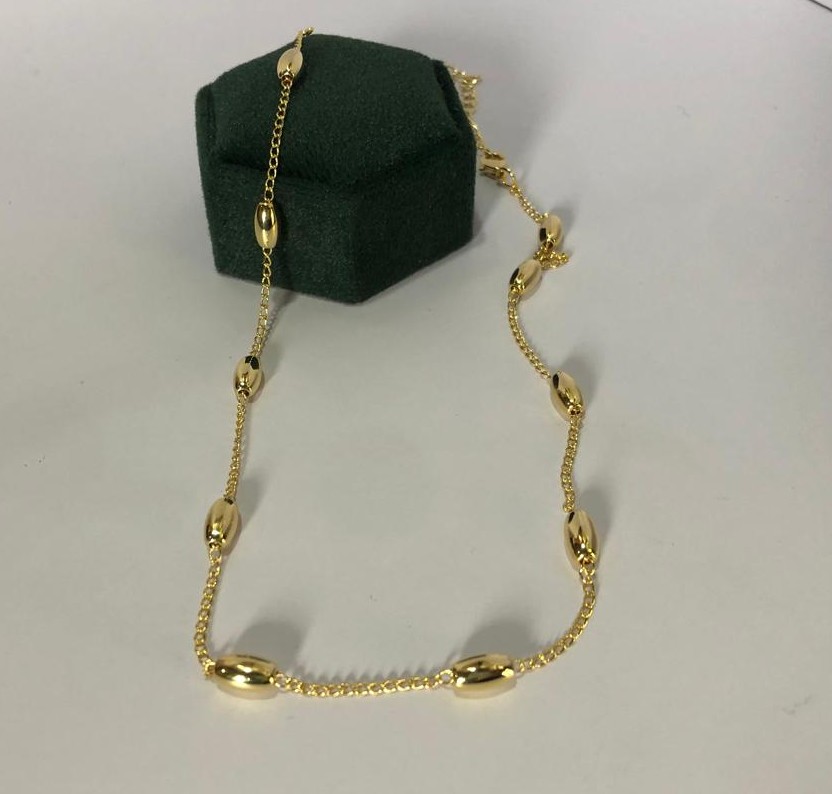 Corrente de elos e gominhos banhados a ouro; pode ser usado de duas formas: