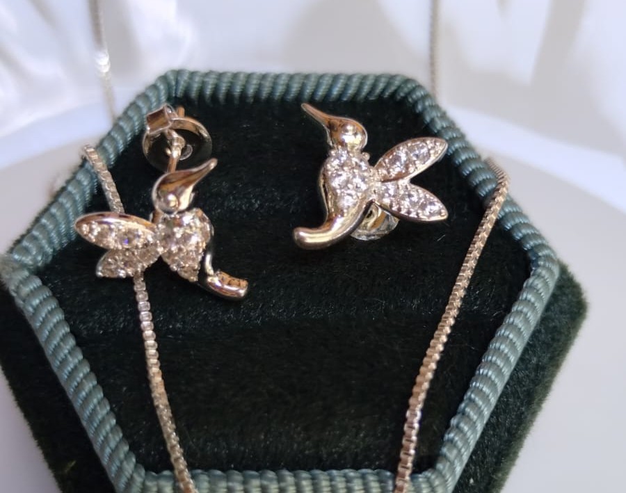 Brinco e pingente em formato de beija flor todo cravejado em zircônias.