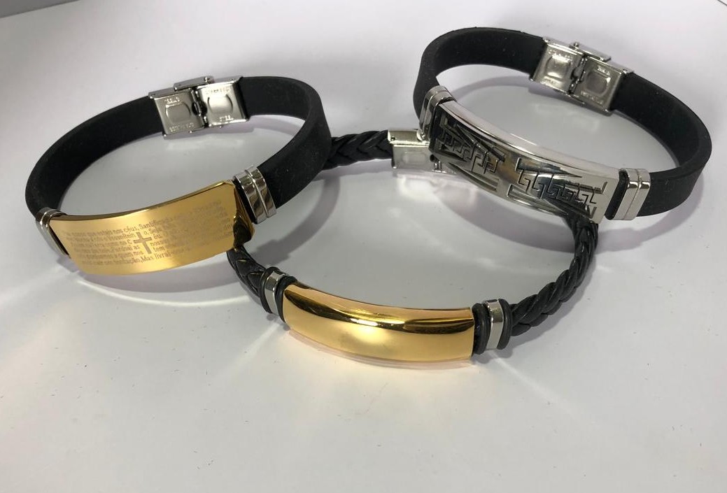 Pulseiras masculinas de couro ecológico e metais em aço inoxidável ouro ou prateado.